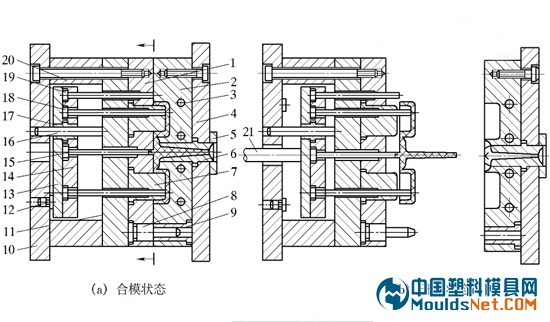 側(cè)向分型與抽芯機(jī)構(gòu) | 當(dāng)有些塑件有側(cè)向的凹凸形狀的孔或凸臺(tái)時(shí),須先把側(cè)向的凹凸形狀的瓣合模塊或側(cè)向的型芯從塑件上脫開(kāi)或抽出 |